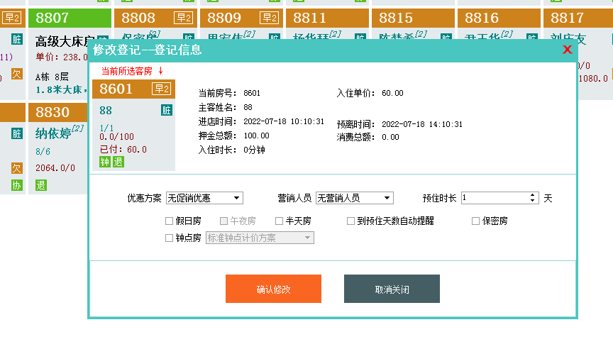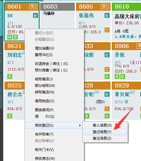 如没产生房费,可以点右键修改。如果产生了房费就不行了。只能退掉重开。